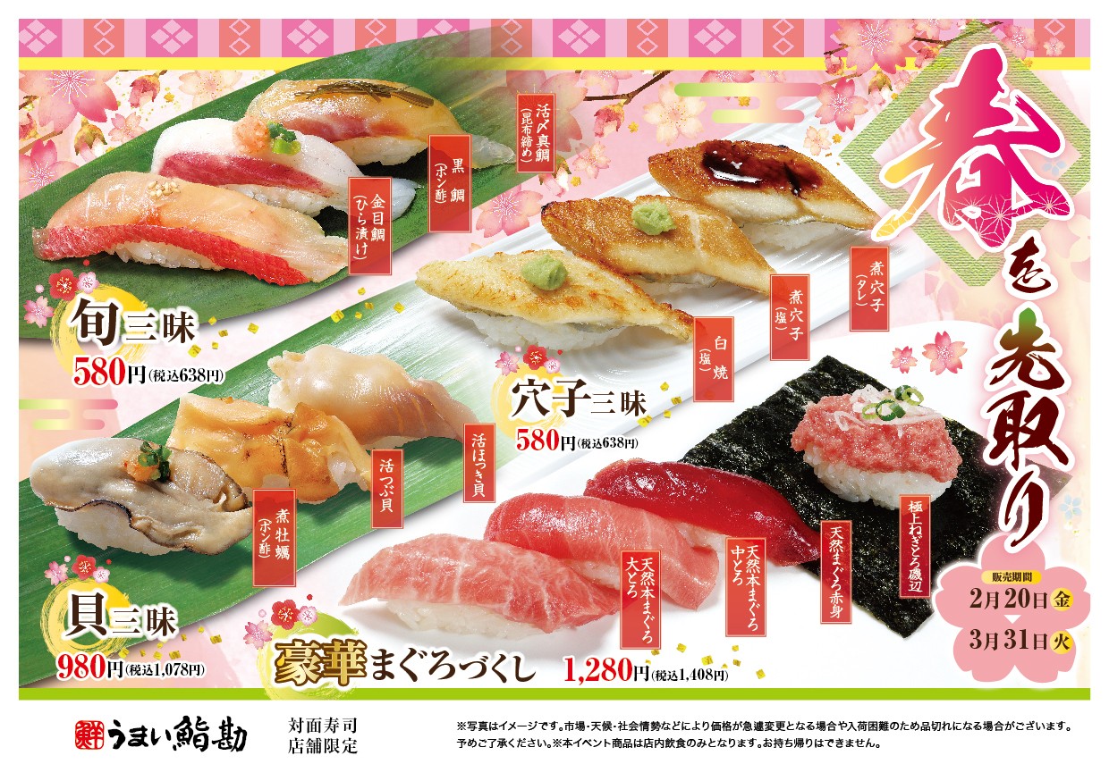 肌寒い季節は続きますが、暦の上ではもう春。入荷する鮮魚も春の顔ぶれ。待ちに待った春の味わいを、お寿司で堪能してはいかがでしょうか。うまい鮨勘では、回転寿司店舗・ゆとろぎ店舗、東北対面寿司店舗それぞれの業態で、この時期限定のネタを取り揃えたメニューを販売いたします。