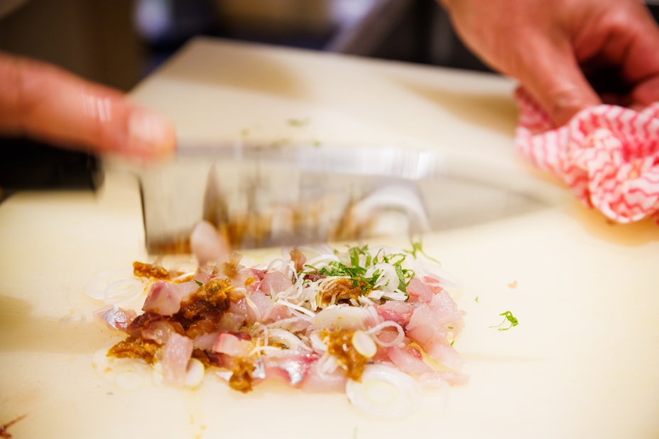 アジの一大漁場である房総半島で生まれた「なめろう」は、「皿まで舐めるほどうまい」が名の由来。三枚におろしたアジを包丁で叩き、味噌、香味野菜と和える料理です。髙橋さんはネギ、大葉、おろし生姜、ミョウガ、胡麻を合わせました。「お家で作る時にアジの身の脂が薄いようなら、胡麻油を少し足して作るとコクが増しますよ」。