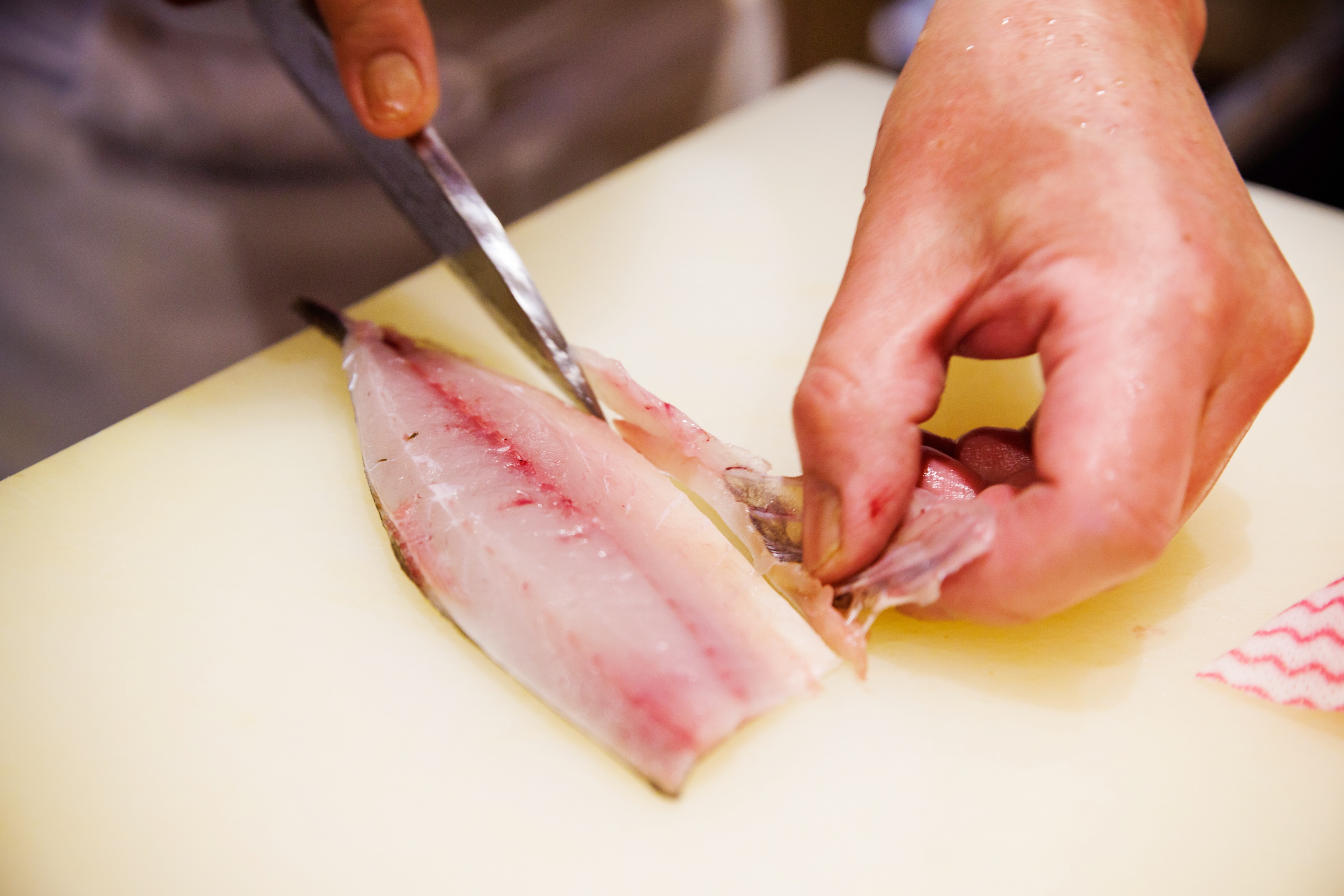 「梅雨が来て海に真水が入るとアジはおいしくなる、と言われています」と店長の髙橋さん。この日に入荷したのは長崎のアジ。アジやイワシのうまい店はいい店と言われる通り、『うまい鮨勘』では時季によって最高のアジを求め仕入れる港を変えています。鱗を取ったら頭を落とし、腹の中を掃除して氷の入った塩水へ。こうすることで身がきゅっと締まり、ツヤが戻るのです。三枚におろしたら腹骨を外し、小骨は「骨抜き」で一本一本丁寧に抜き取っていきます。